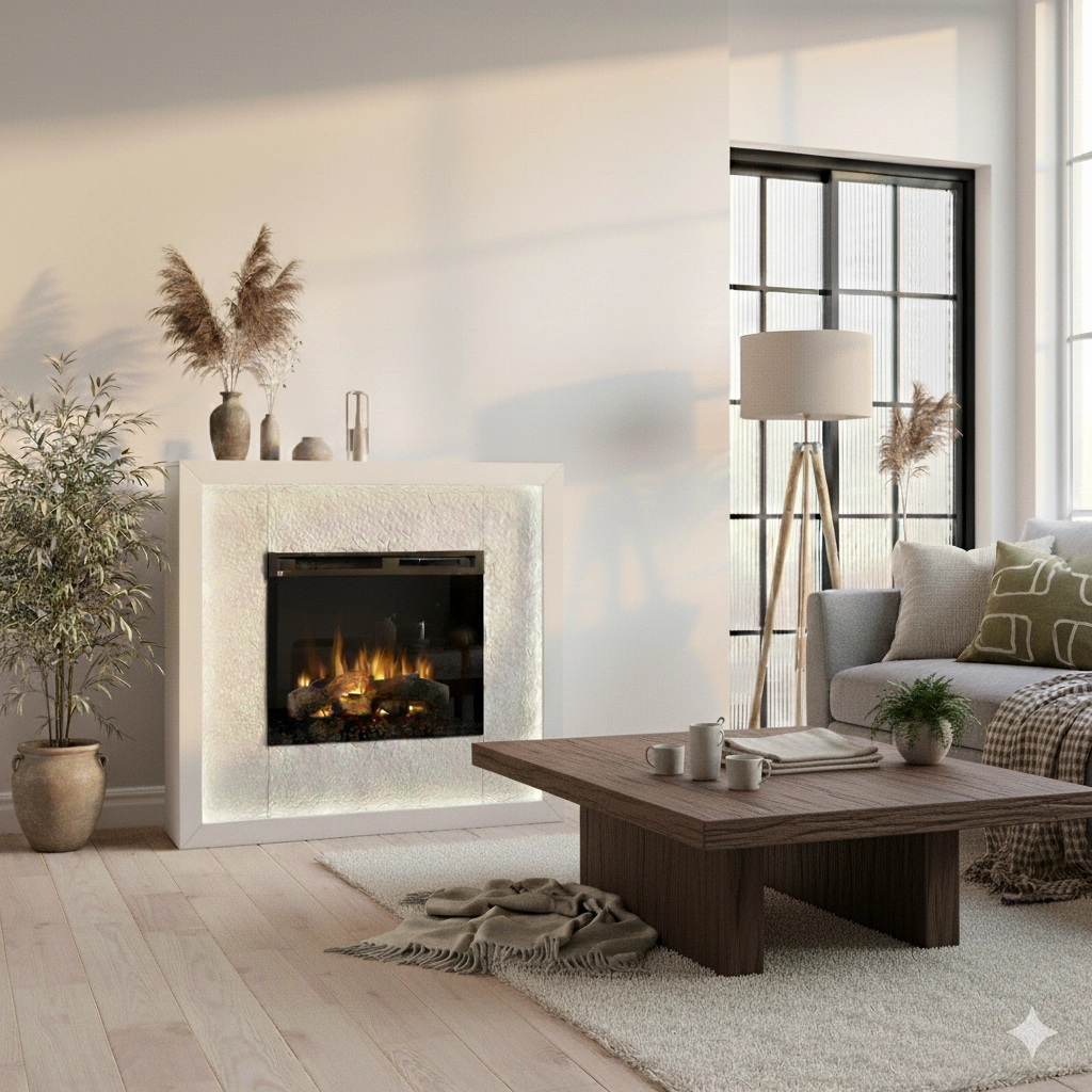 - kominek elektryczny, wolnostojący, obudowa kominka, nowoczesny kominek ledowy z funkcją grzania, na prąd, biały mat, fornir kamienny