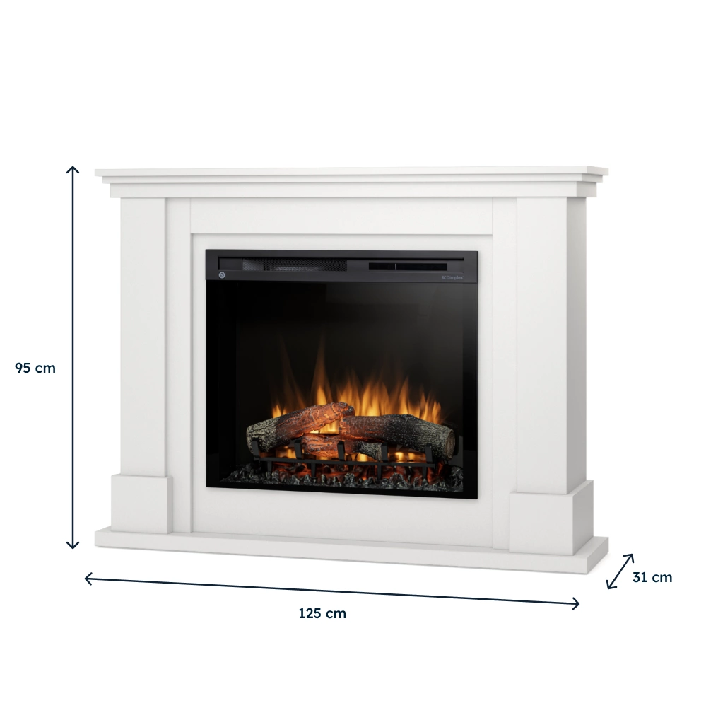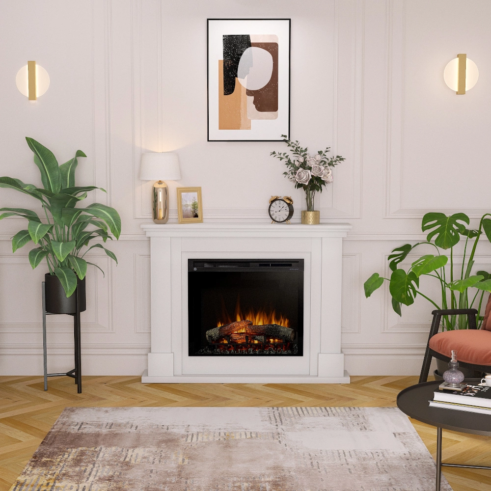 Efekt płomienia generowany jest przez energooszczędny wkład kominkowy Dimplex XHD w rozmiarze 28". W zależności od indywidualnych preferencji, kominek może rozświetlać delikatny blask lub wysokie płomienie o różnym podświetleniu.