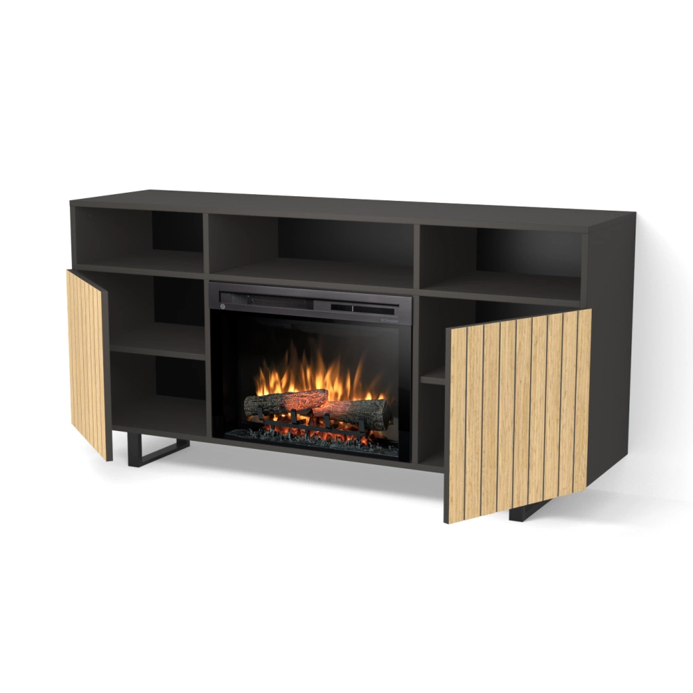 - szafka RTV z wkładem kominkowym, stojąca, nowoczesna, kominek ledowy z realistycznym efektem płomienia, na prąd, czarny, fornir drewniany