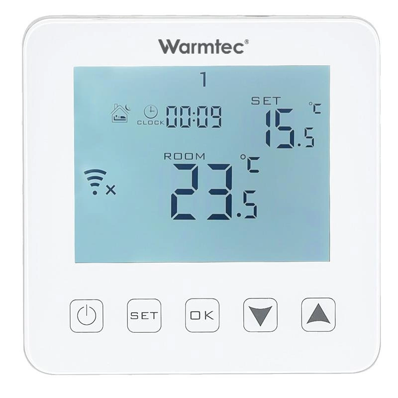 Regulator temperatury Warmtec PRT-01 to dwuczujnikowy, elektroniczny termostat z możliwością programowania pracy oraz sterowania Wi-Fi za pośrednictwem aplikacji zainstalowanej na urządzeniu mobilnym z systemem Android lub iOS. Wyposażony został w nowoczesny, dotykowy wyświetlacz LCD.