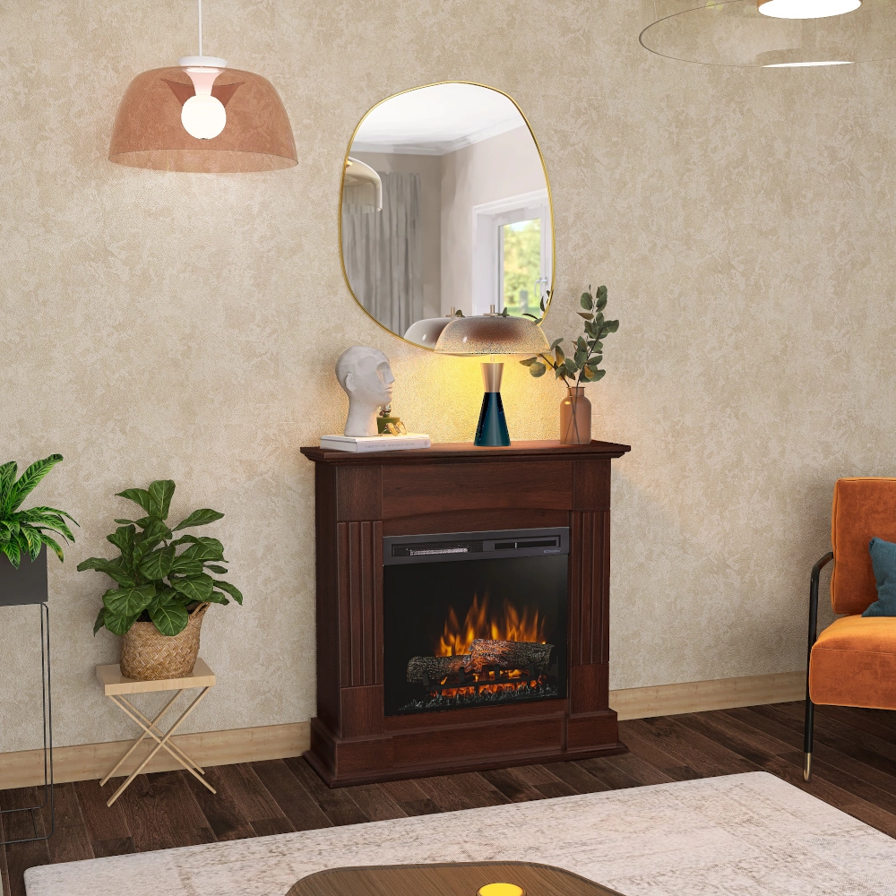 Obudowa została wykonana z najwyższej jakości fornirowanej płyty MDF (fornir dębowy) w kolorze ciemnego brązu, dzięki czemu kominek świetnie prezentuje się w pomieszczeniach dodając elegancji i klasy całości wykończenia.