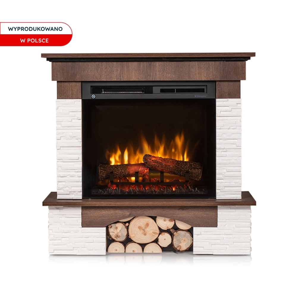 - wolnostojący kominek elektryczny w kolorze ciemnego orzecha wykończony kamieniem ozdobnym z technologią generowania efektu płomienia Optiflame oraz funkcją grzewczą