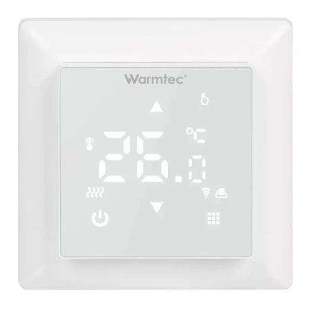 Regulator temperatury Warmtec WRT31W to dwuczujnikowy termostat elektroniczny, z możliwością programowania oraz sterowania Wi-Fi, za pośrednictwem aplikacji zainstalowanej na urządzeniu mobilnym z systemem Android lub iOS. Wyposażony został w nowoczesny, dotykowy wyświetlacz LCD.