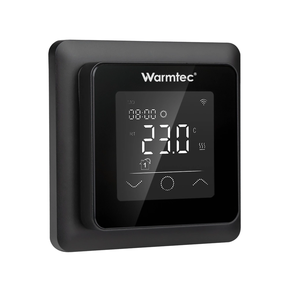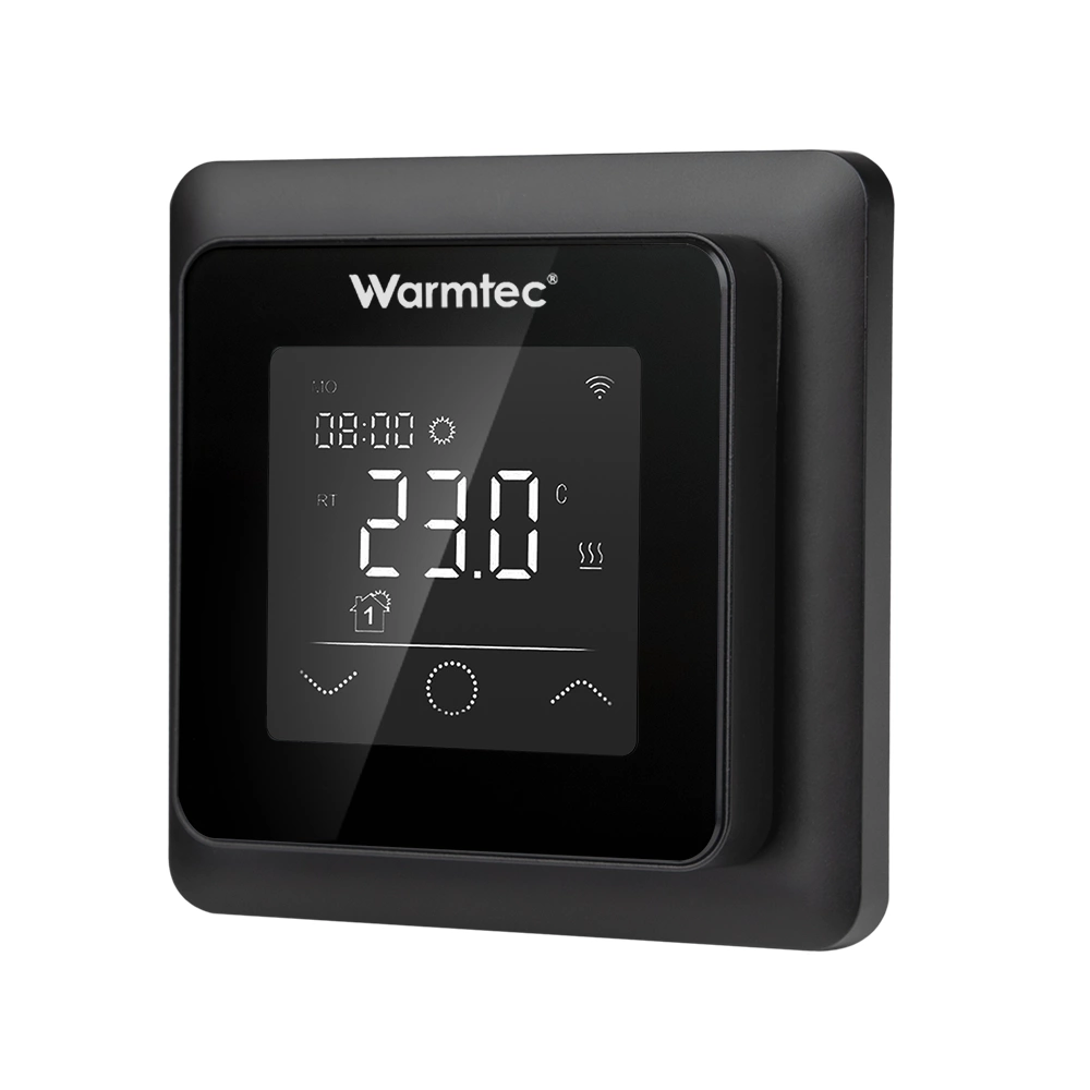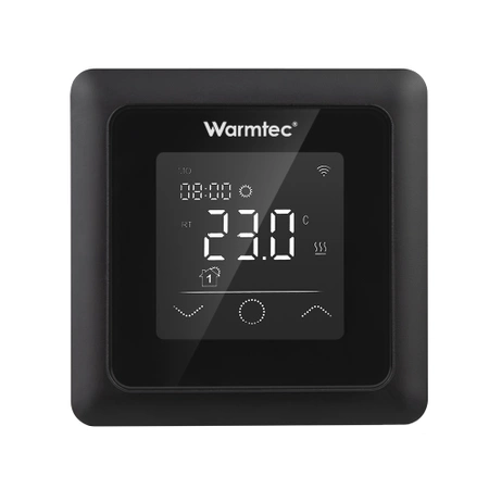 Regulator temperatury Warmtec ZTS Czarny to dwuczujnikowy termostat elektroniczny, z możliwością programowania oraz sterowania Wi-Fi, za pośrednictwem aplikacji zainstalowanej na urządzeniu mobilnym z systemem Android lub iOS. Wyposażony został w nowoczesny wyświetlacz LCD z dotykowymi przyciskami.