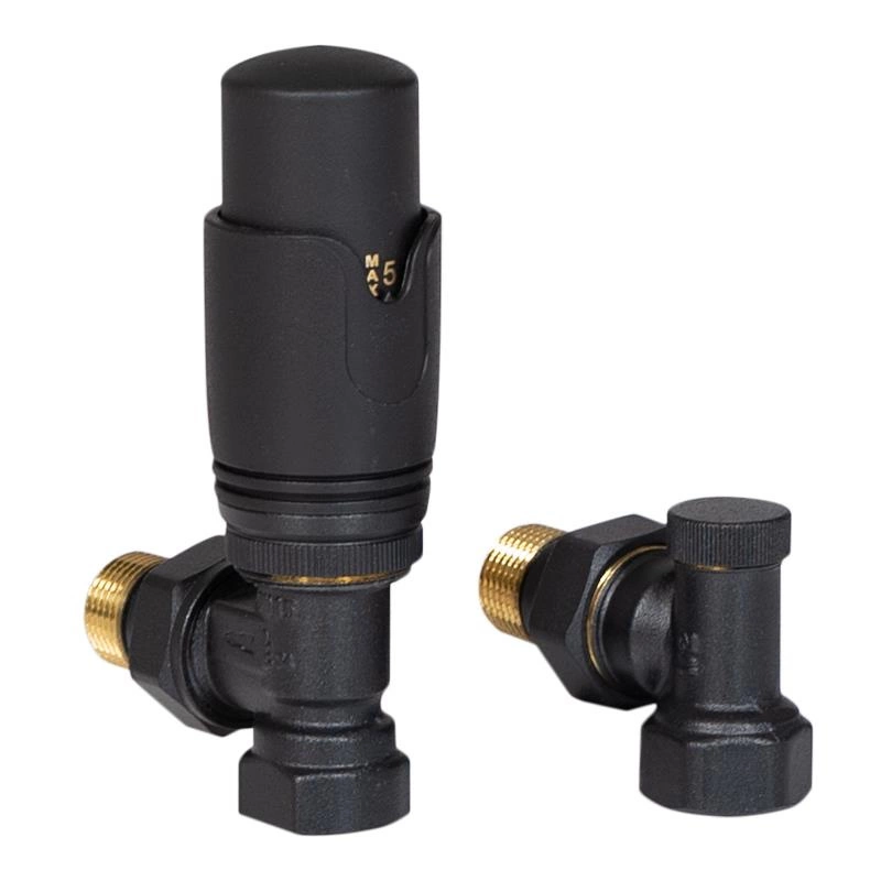 Zestaw zaworów kątowych termostatycznych Warmtec w kolorze antracytu/czarnym, przeznaczony jest do grzejników podłączonych do instalacji centralnego ogrzewania, umożliwiając automatyczną regulację temperatury w pomieszczeniu, dzięki czemu pozwala na znaczne oszczędności energii cieplnej - tym samym zredukowanie kosztów ogrzewania.