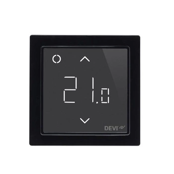 Regulator temperatury Devi Smart to dwuczujnikowy termostat elektroniczny z możliwością programowania oraz sterowania Wi-Fi, za pośrednictwem aplikacji zainstalowanej na urządzeniu mobilnym z systemem Android lub iOS. Wyposażony został w nowoczesny, dotykowy wyświetlacz LCD. Wysoki stopień ochrony (IP21) umożliwia montaż w miejscu o zwiększonej wilgotności, np. łazience.