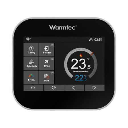 Regulator temperatury Warmtec ITS to bezpotencjałowy, dwuczujnikowy termostat elektroniczny, z możliwością programowania oraz sterowania Wi-Fi, za pośrednictwem aplikacji zainstalowanej na urządzeniu mobilnym z systemem Android lub iOS. Wyposażony został w nowoczesny, dotykowy i kolorowy wyświetlacz LCD.